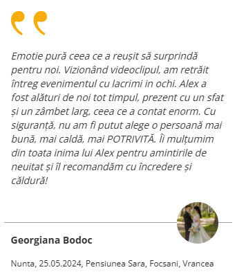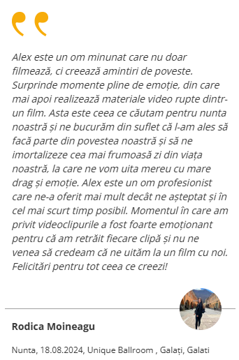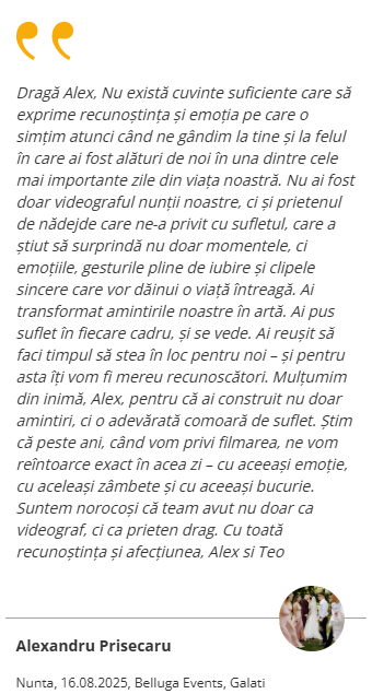 Sunt Alexandru Casleanu, videograf de nuntă și evenimente cu o pasiune profundă pentru emoțiile autentice. Cu o experiență de peste 10 ani, am învățat că cele mai frumoase cadre nu se filmează — se simt. Fie că este vorba despre o nuntă, un botez sau un eveniment corporate, surprind naturalețea și bucuria fiecărui moment.